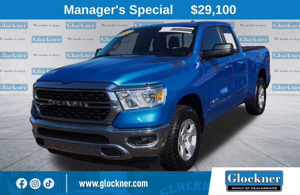 Glockner Chevrolet is proud to offer this good-looking 2022 Ram 1500 in Hydro Blue Pearlcoat. This 2022 Ram 1500 has passed our comprehensive inspection and comes with the following features; Quick Order Package 23Z Big Horn (Big Horn Badge), 1500 Big Horn/Lone Star, Glockner Certified Certified, 4D Quad Cab, 3.6L V6 24V VVT, 4WD, Hydro Blue Pearlcoat, 3 Rear Seat Head Restraints, 3.21 Rear Axle Ratio, 4 Way Front Headrests, 4-Wheel Disc Brakes, 48V Belt Starter Generator, 6 Speakers, ABS brakes, Air Conditioning, Alloy wheels, AM/FM radio, Black Exterior Mirrors, Brake assist, Bumpers: chrome, Cloth Bench Seat, Compass, Convex Wide-Angle Mirror Insert, Delay-off headlights, Driver door bin, Dual front impact airbags, Dual front side impact airbags, Electronic Stability Control, Emergency communication system: SiriusXM Guardian, Front anti-roll bar, Front Center Armrest w/Storage, Front fog lights, Front License Plate Bracket, Front reading lights, Front Seat Back Map Pockets, Front wheel independent suspension, Fully automatic headlights, Global Telematics Box Module (TBM), GPS Antenna Input, Heated door mirrors, Illuminated entry, Integrated Voice Command w/Bluetooth, Leather steering wheel, Low tire pressure warning, Manual Adjust 4-Way Front Passenger Seat, Occupant sensing airbag, Outside temperature display, Overhead airbag, Overhead console, Panic alarm, ParkView Rear Back-Up Camera, Passenger door bin, Passenger vanity mirror, Power door mirrors, Power steering, Power windows, Radio data system, Radio: Uconnect 3 w/5 Display, Rear 60/40 Folding Seat, Rear anti-roll bar, Rear seat center armrest, Rear step bumper, Remote keyless entry, Remote Start System, Speed control, Split folding rear seat, Steering wheel mounted audio controls, Tachometer, Telescoping steering wheel, Tilt steering wheel, Traction control, Trip computer, Variably intermittent wipers, Voltmeter, and Wheels: 18 x 8 Cast-Aluminum Painted.